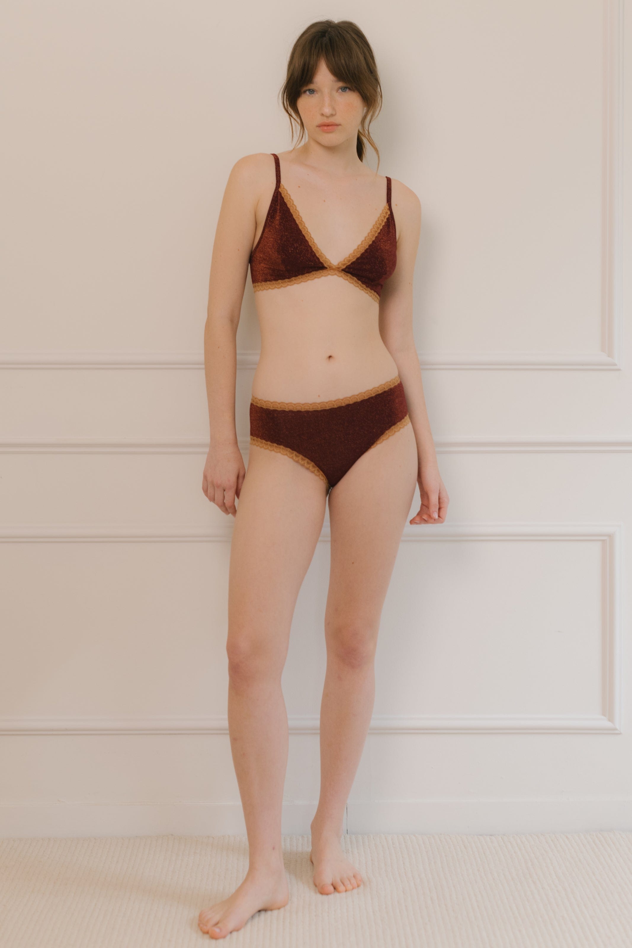 Confeccionado en tejido de lurex en color granate y destellos brillantes en cobre.