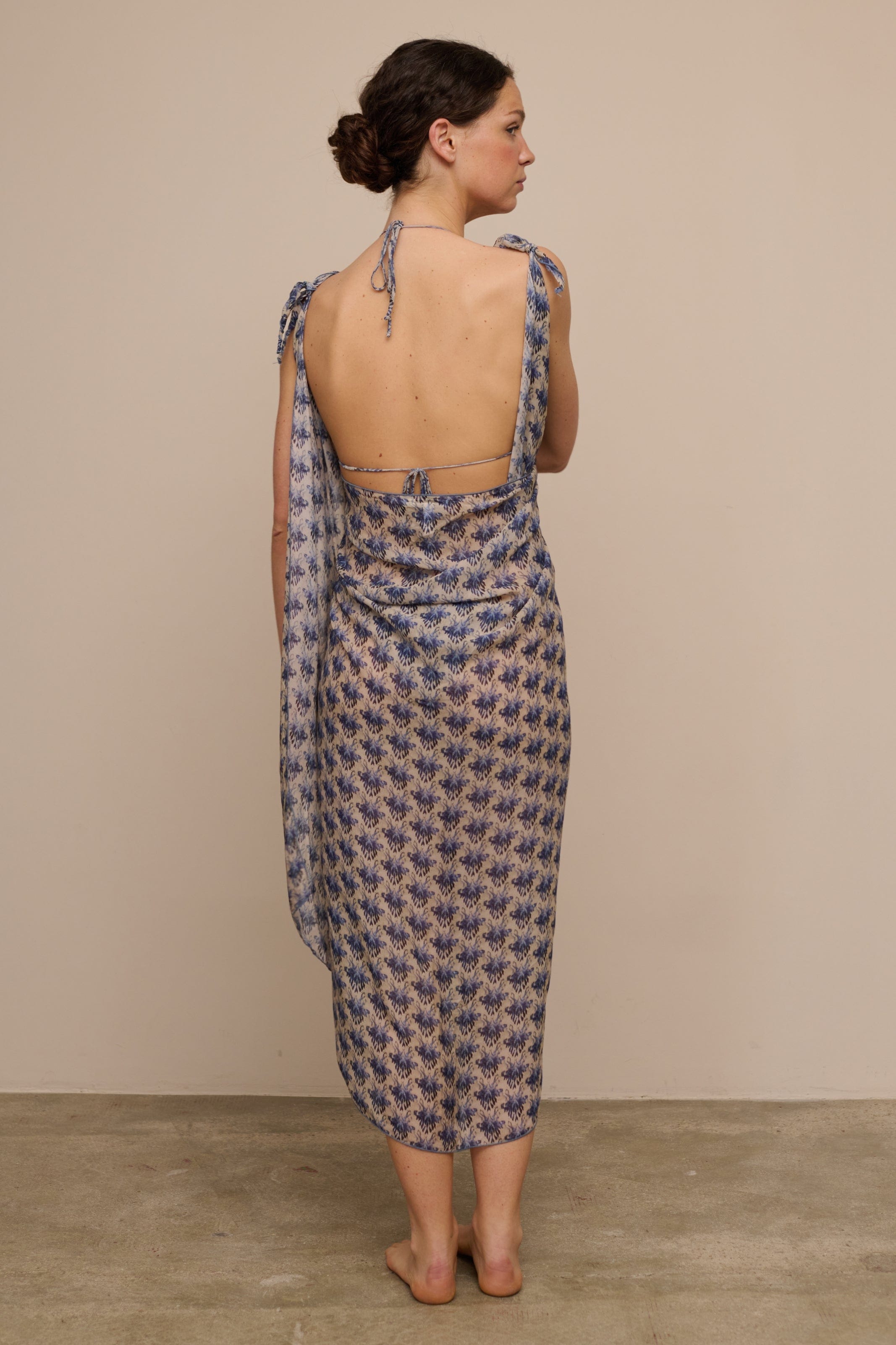 Este pareo largo con estampado de flor azul sobre fondo crudo se convertirá en tu mejor compañero este verano.