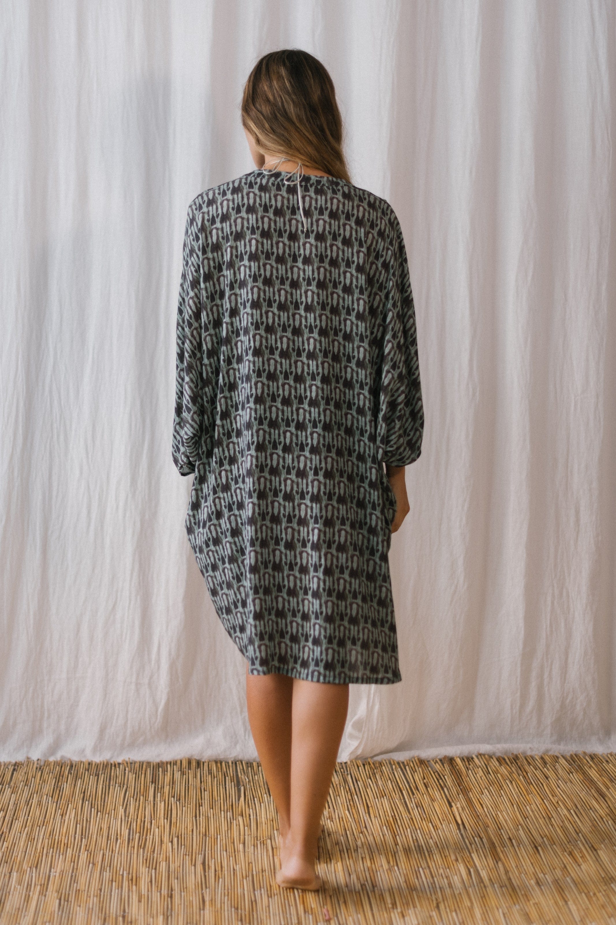 Estampado étnico en tonos marrones sobre fondo verdoso.