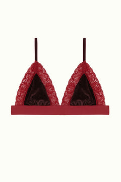Confeccionado en suave terciopelo con acabado de encaje color cereza.