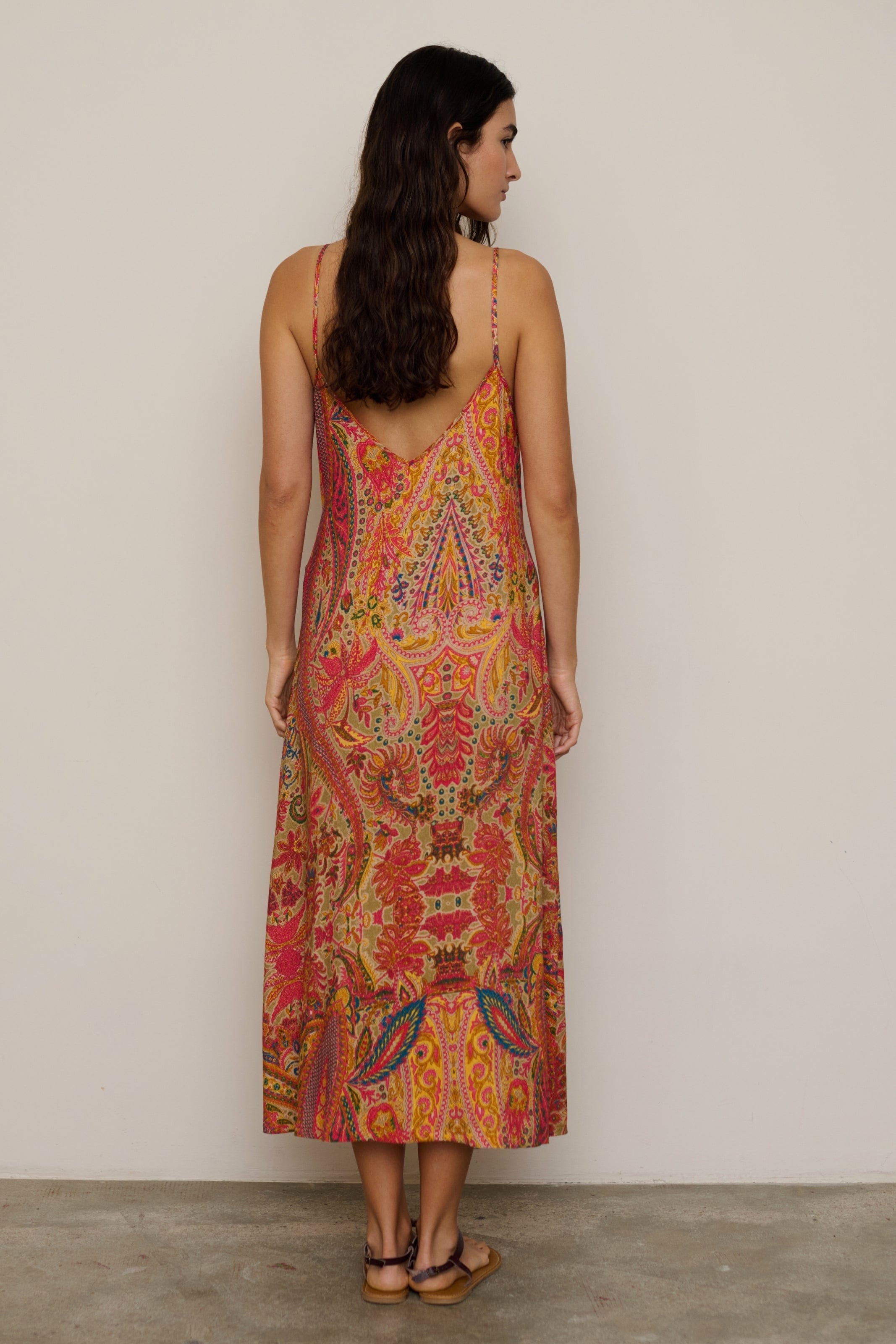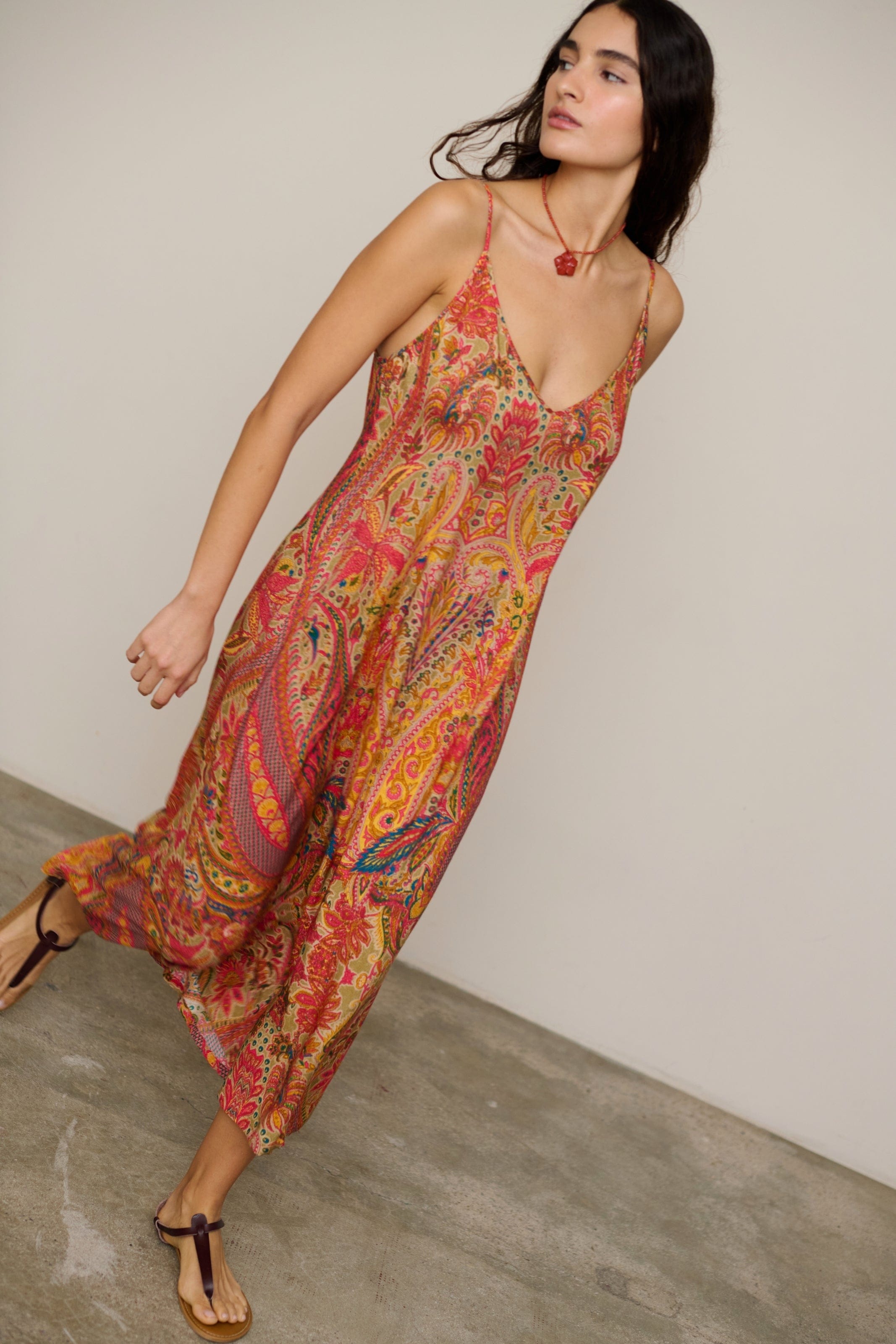 Long dress with straps and a V-neckline.