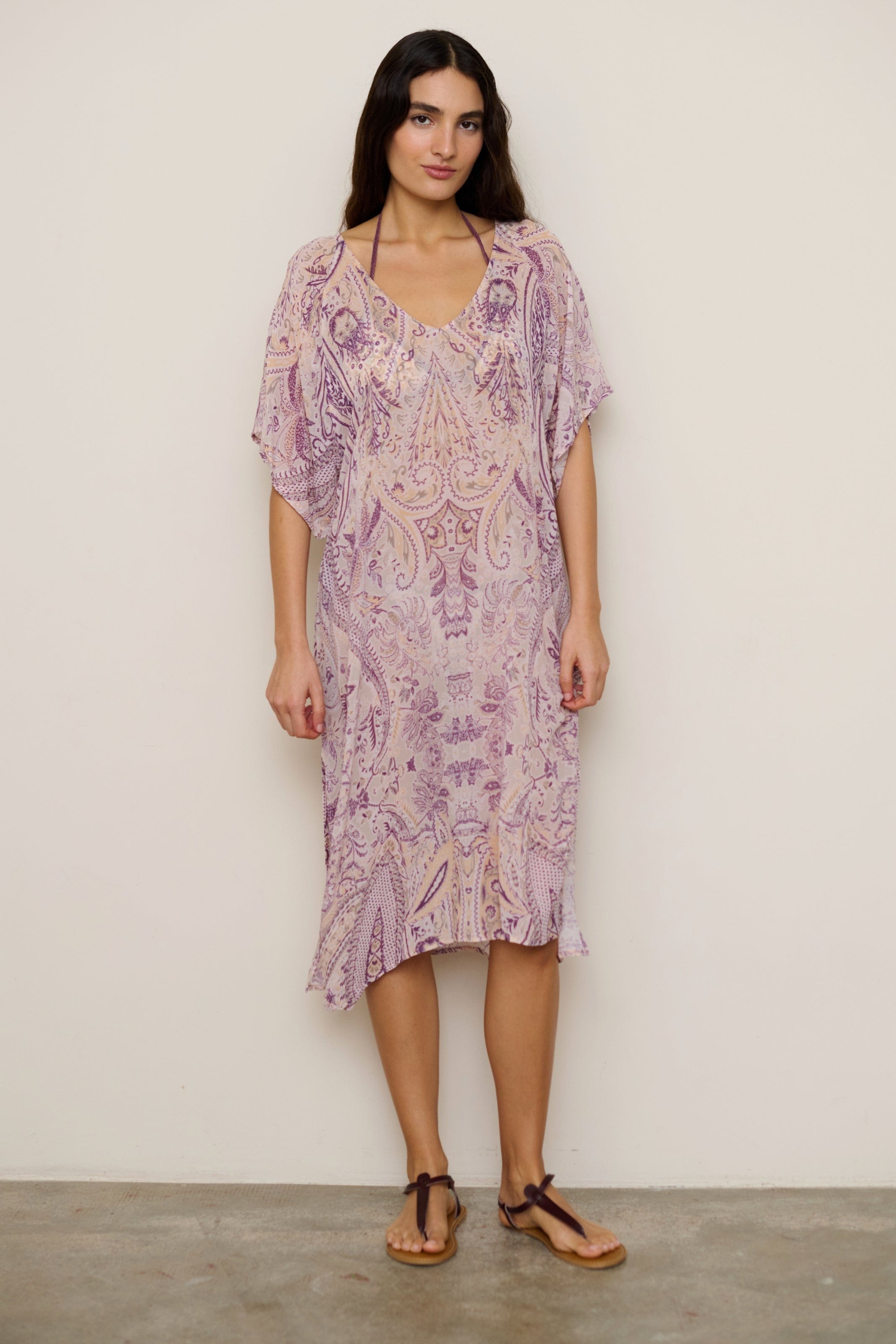 Kaftan-style dress with short flared sleeves and a V-neckline, featuring a flowing silhouette.