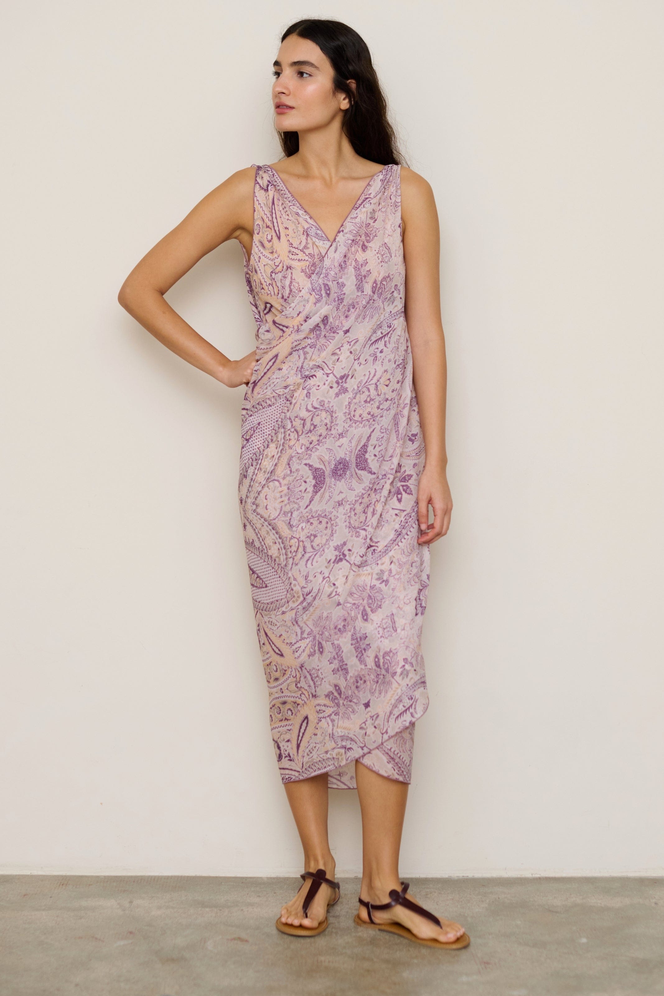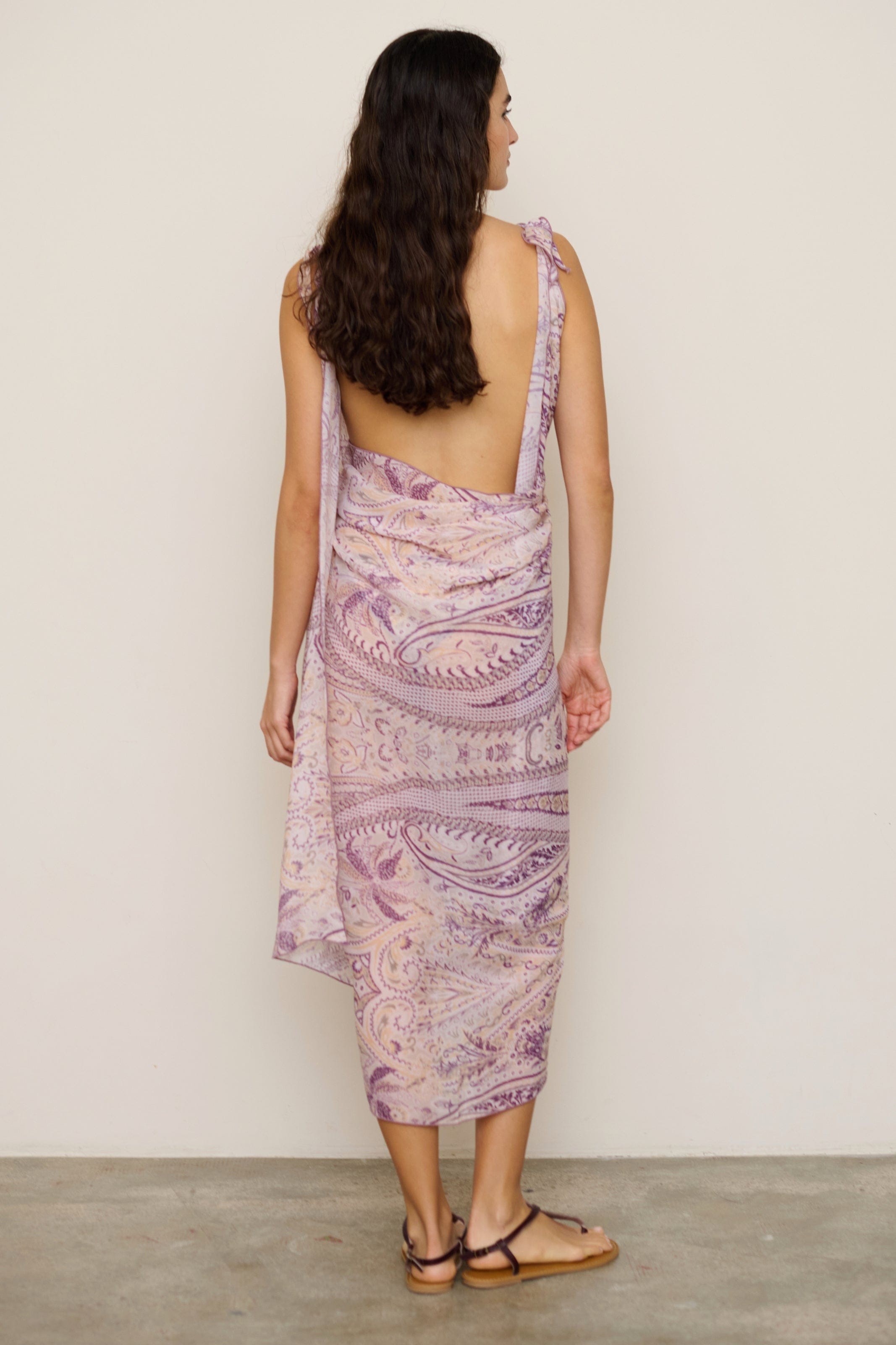 Long sarong with floral paisley print in mauve tones on a beige background. Made from semi-transparent fabric.