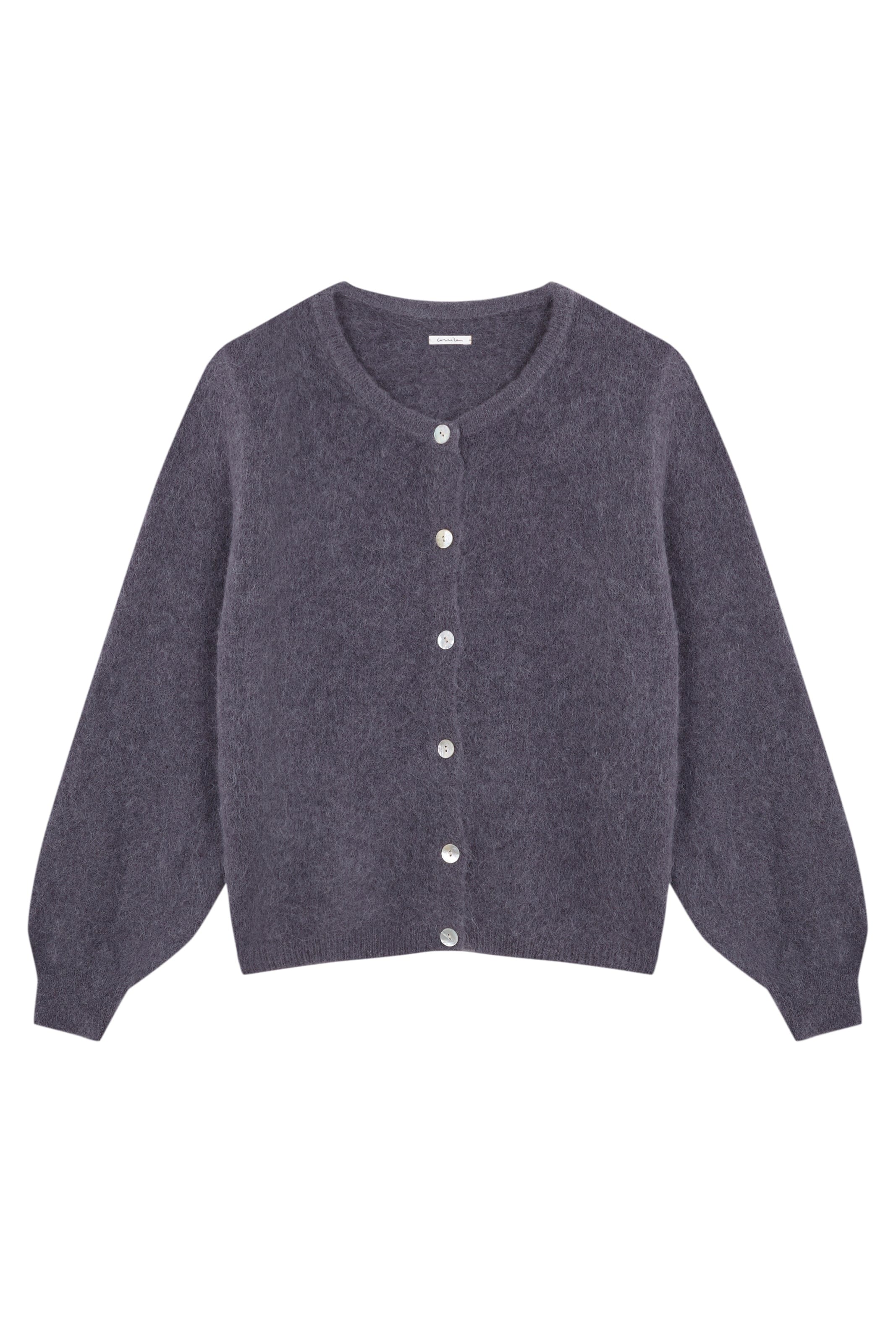 Baby alpaca sweater with mother-of-pearl buttons.