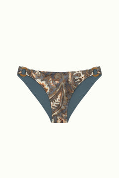 Paisley print in green and beige tones on a prussian blue background with a watercolor effect.