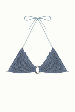Bikini top with bandeau neckline, strapless, and a removable central ring detail, allowing it to convert into a full band.