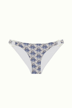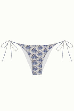 Blue floral print on a raw background, crafted in semi-transparent rustic fabric.