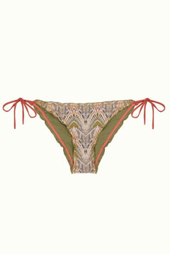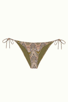 Ikat print on a bright background in shades of green with purple and orange touches, lined with olive green lycra.