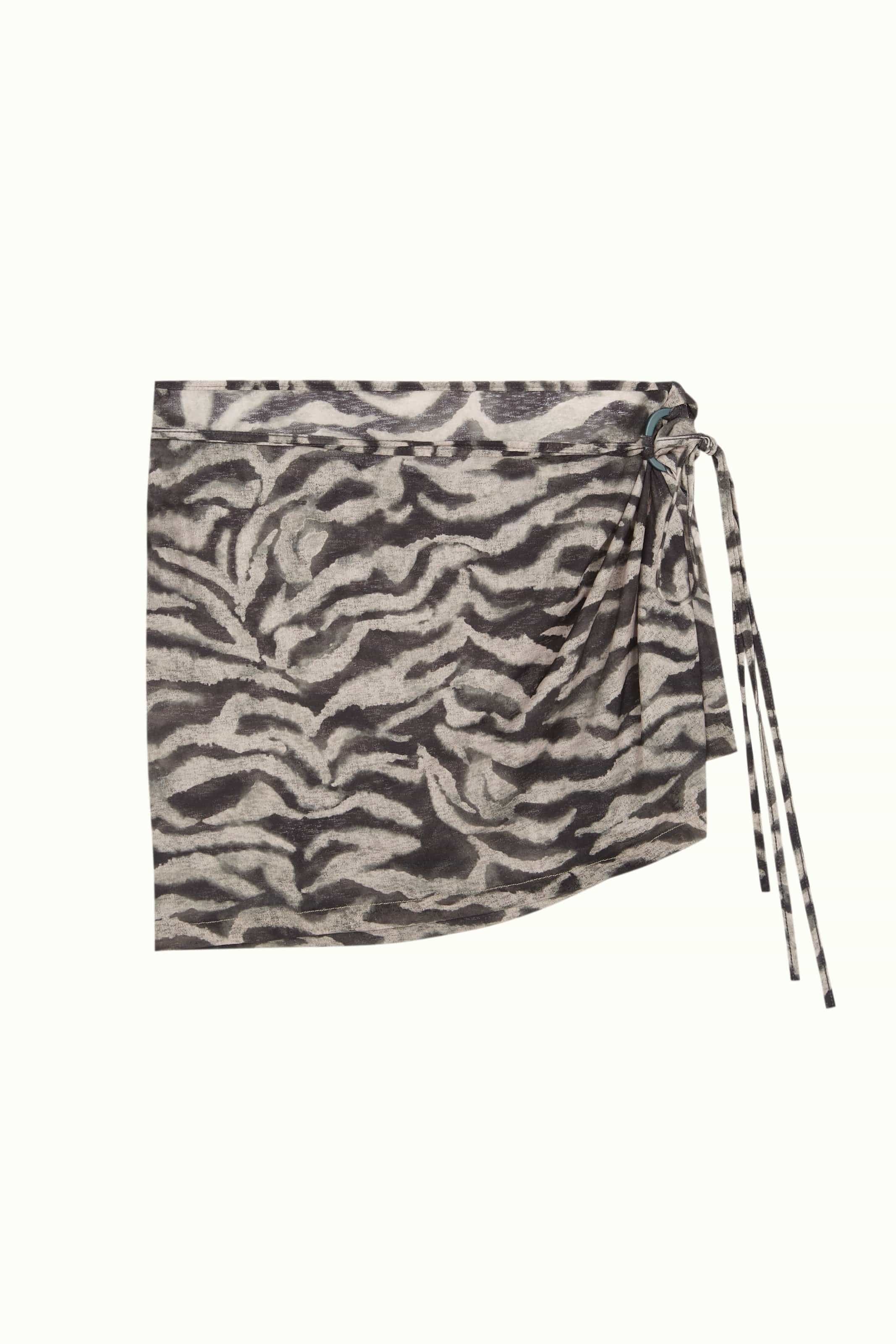 Pareo-style skirt tied at one side, creating an opening on the hip.