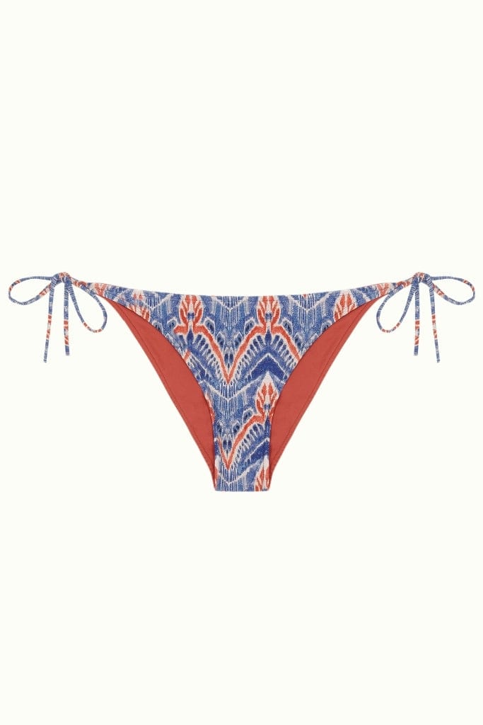 Ikat print on a bright blue and reddish background lined with boiler-colored lycra.