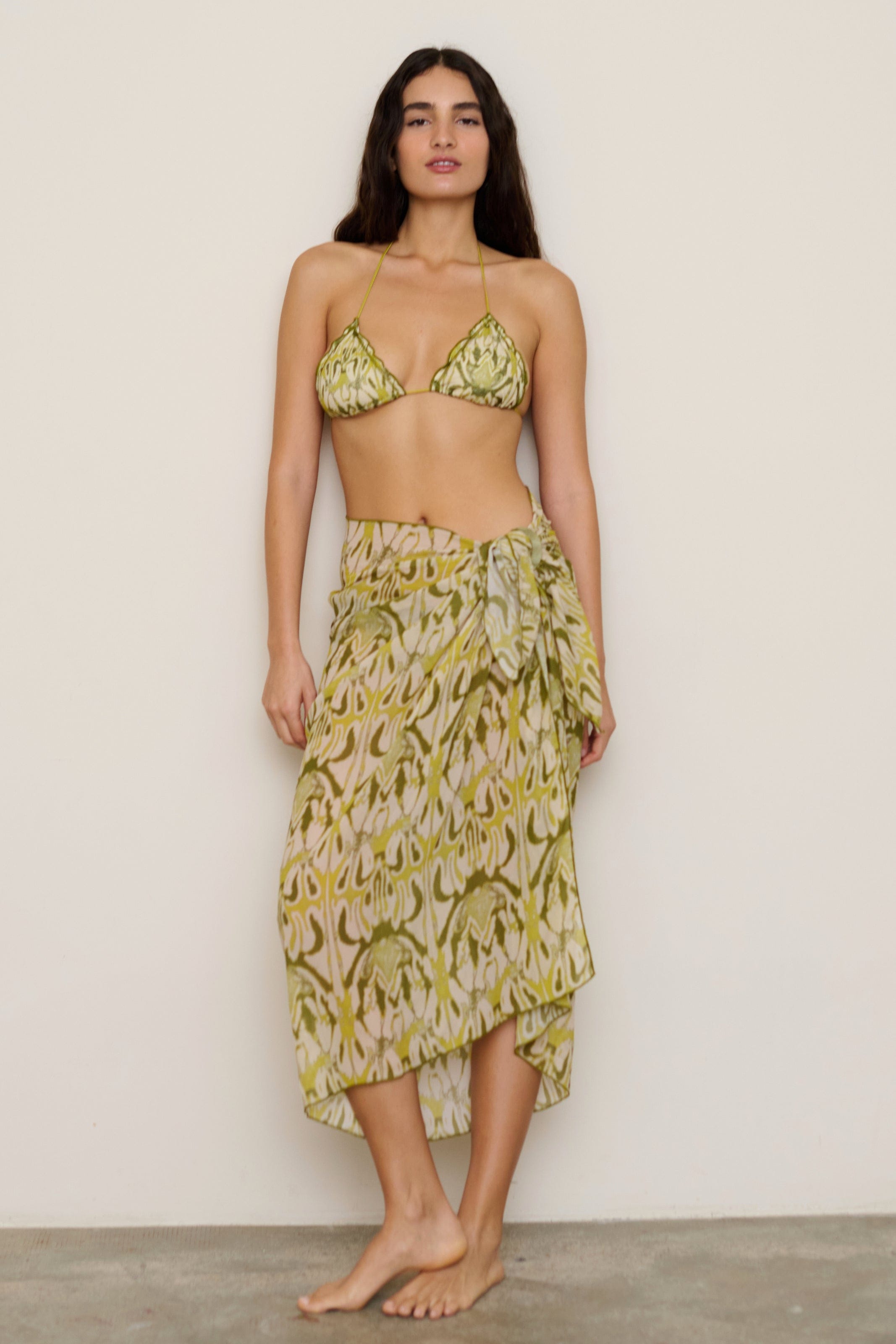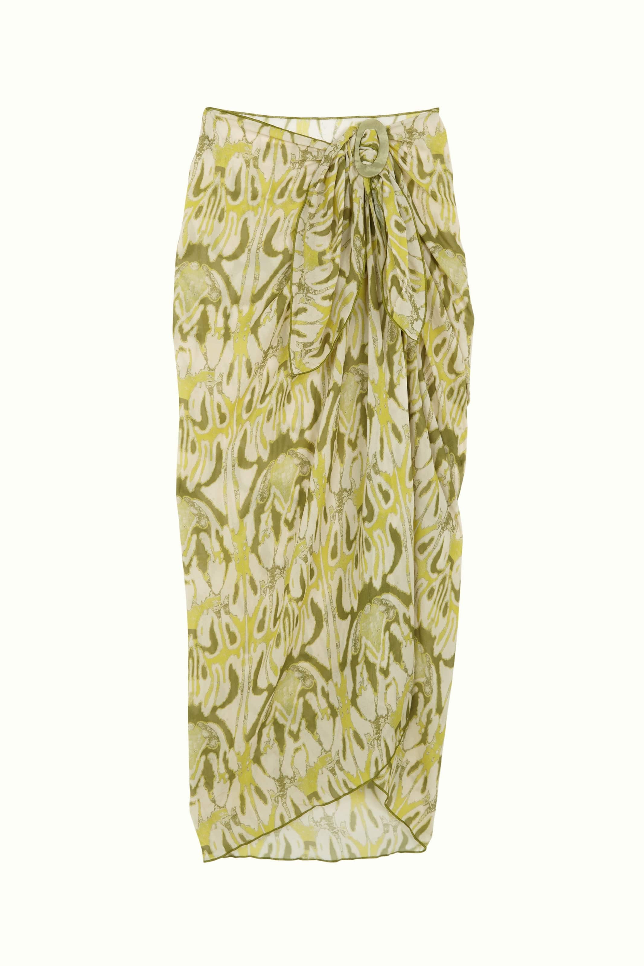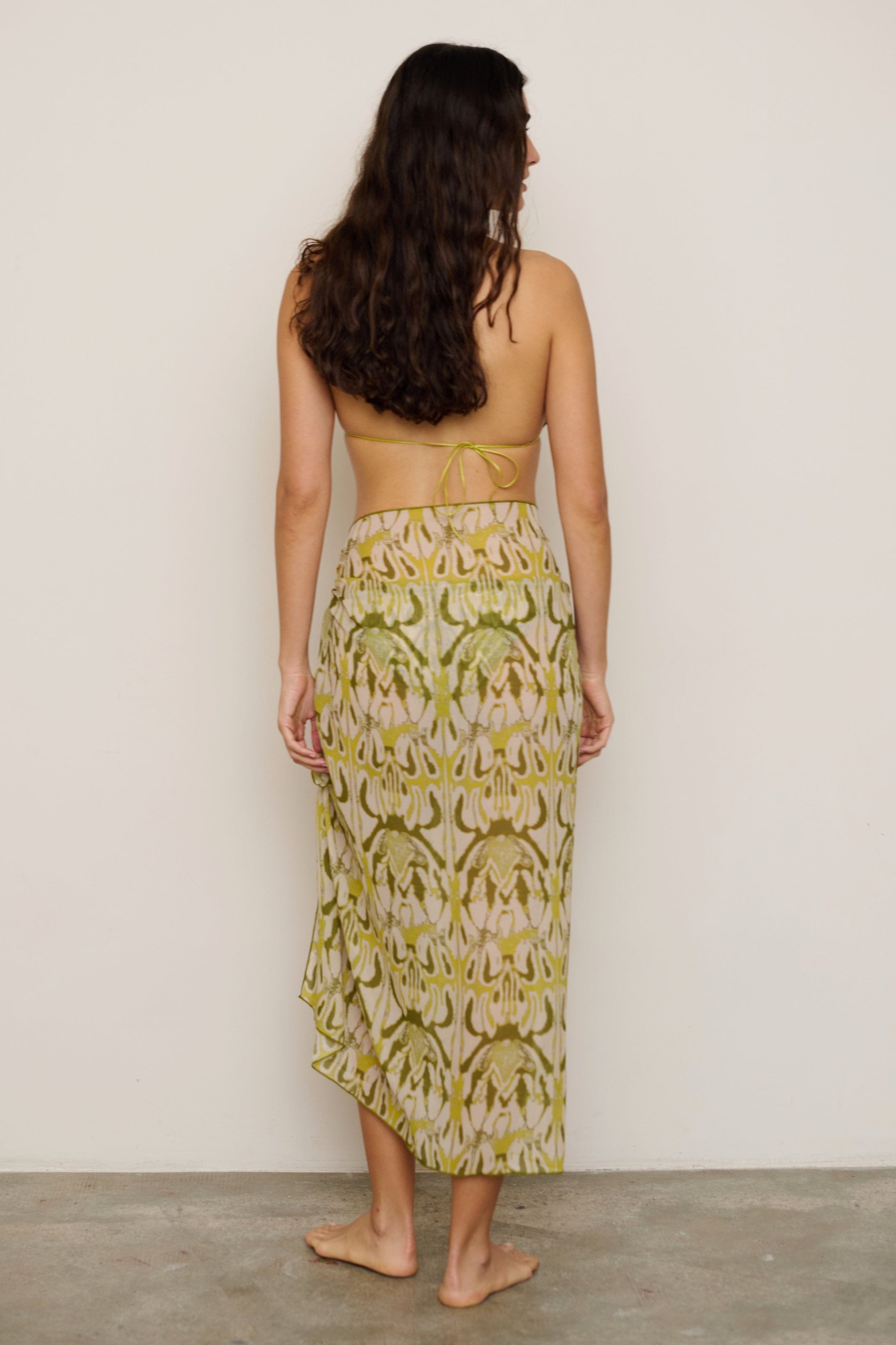 Square sarong skirt. Includes a loop for tying the sarong around the waist or wearing it as a top. Made from semi-sheer fabric.