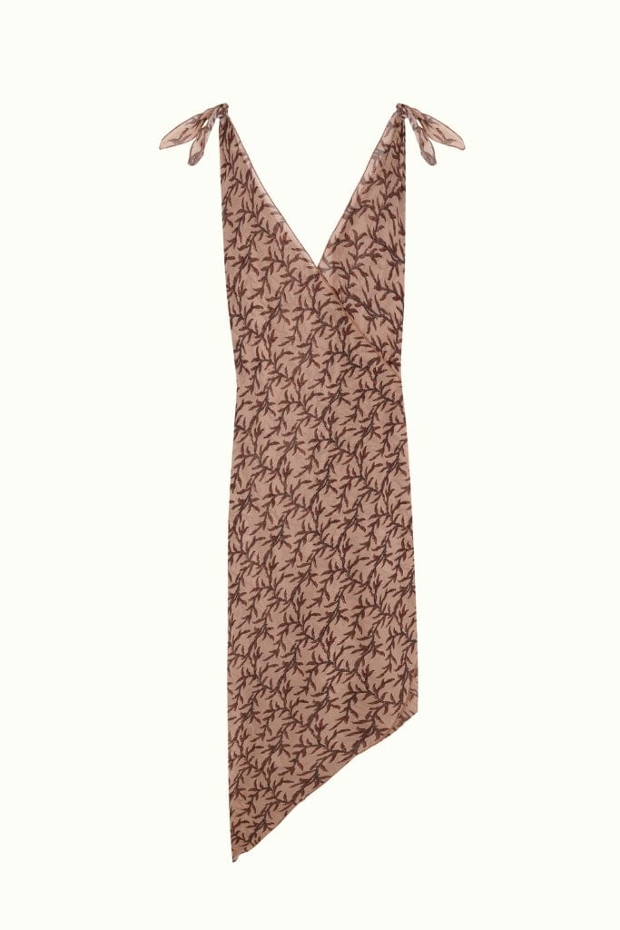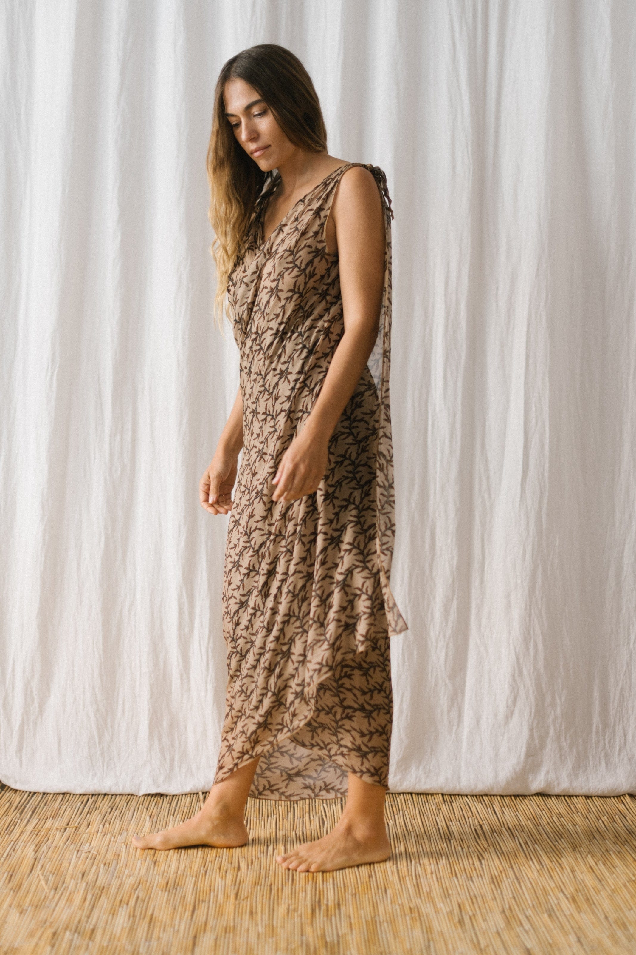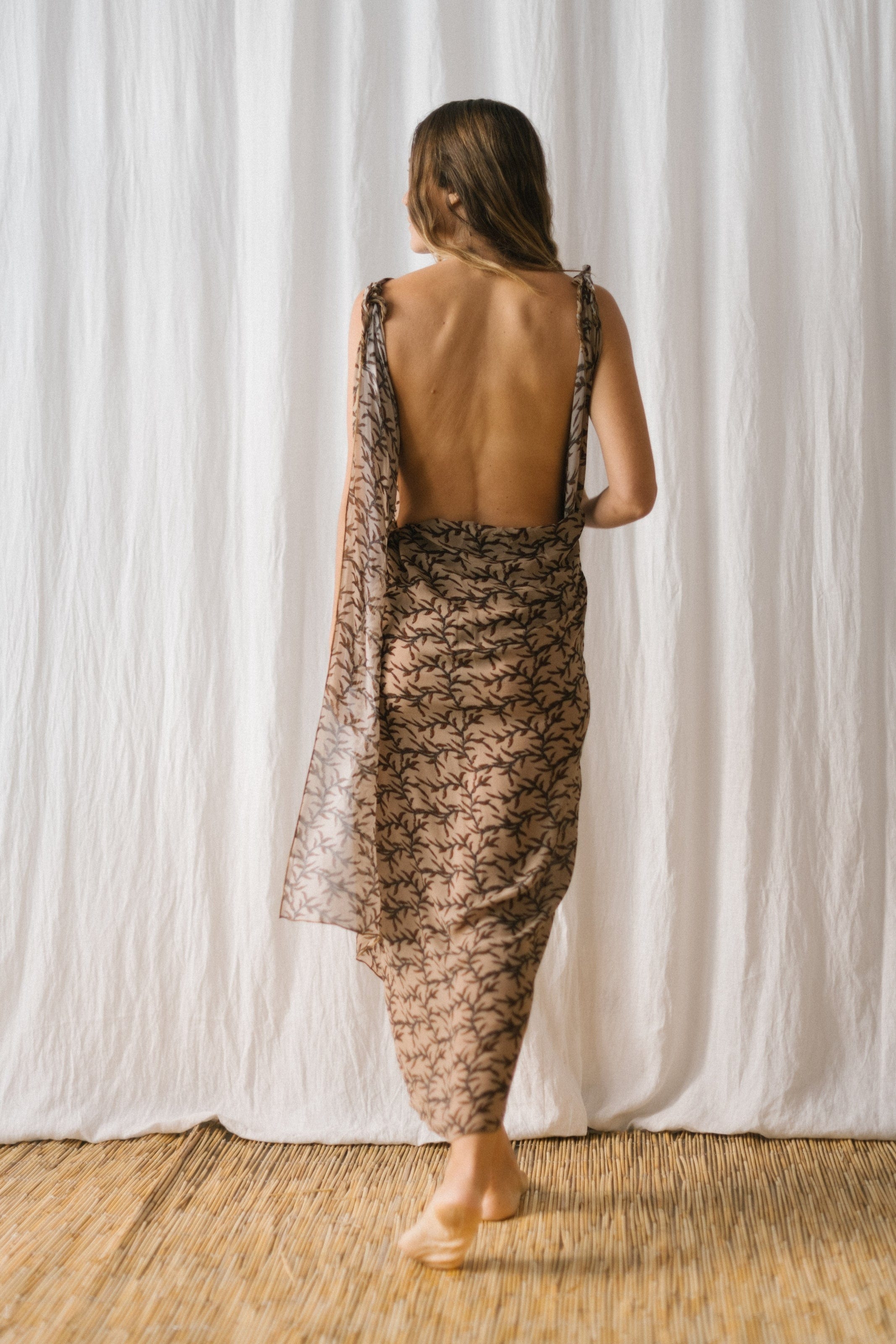 Semitransparent long pareo, with a print of branches in toasted tones with two cuts at the ends that knotting them become sleeves to wear as a dress.