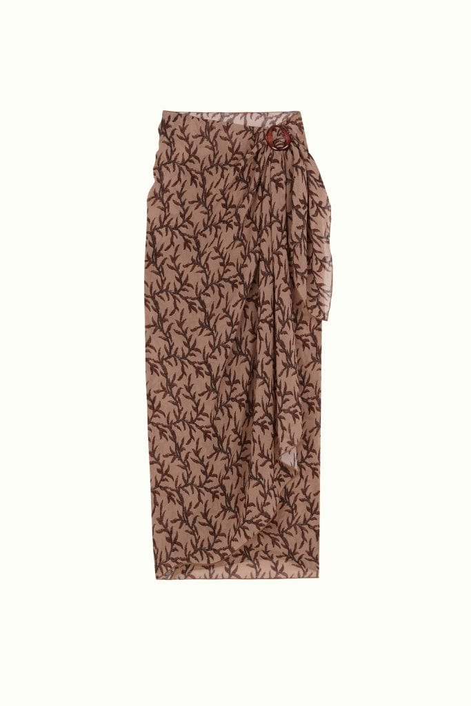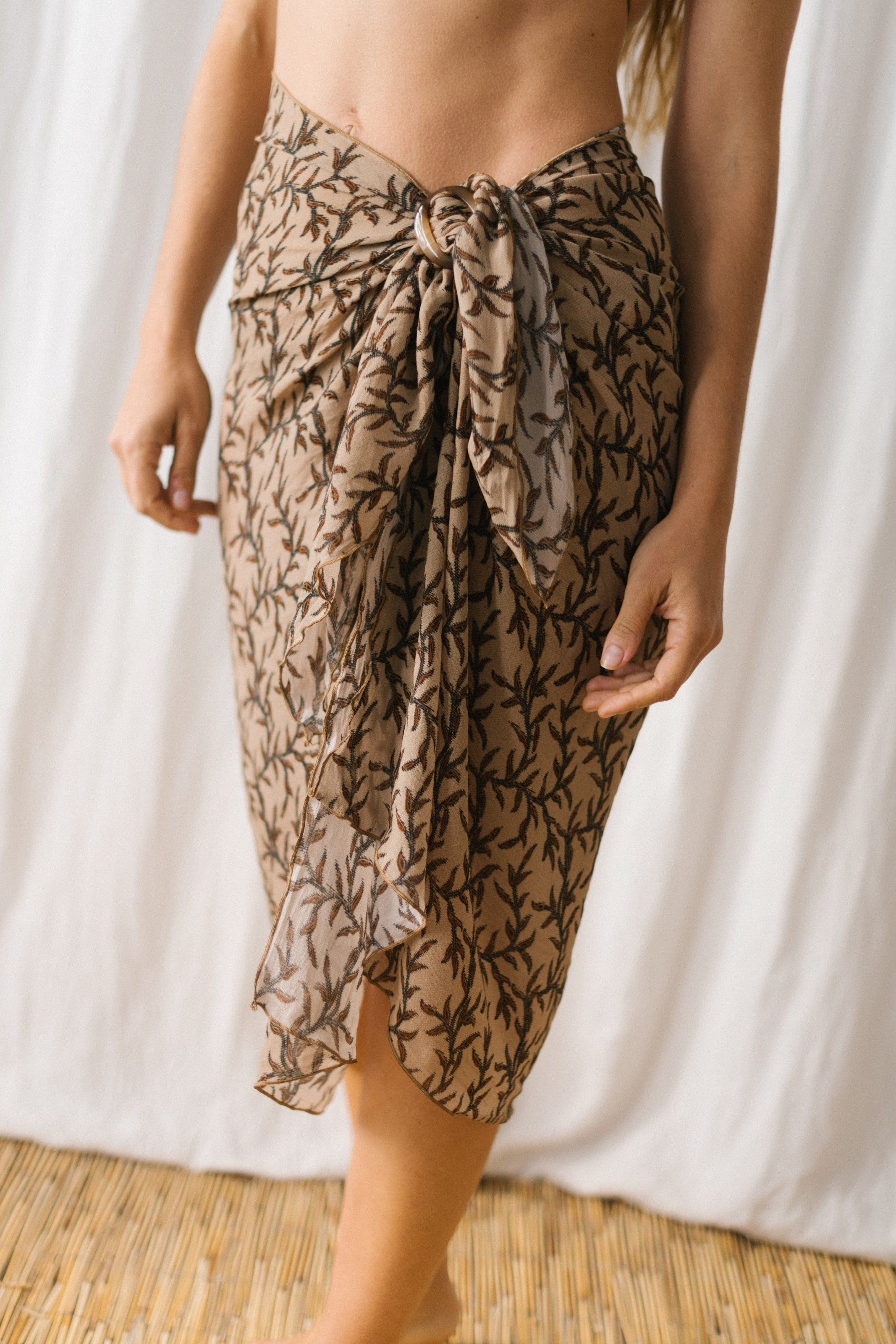 Rectangular viscose sarong with branches print in toasted tones with ring to tie the sarong at the waist or as a top.