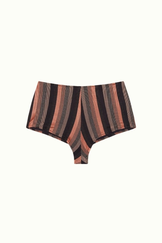 Striped print in black and warm tones, enhanced with copper-colored threads, creates a sophisticated and warm combination lined with black lycra.