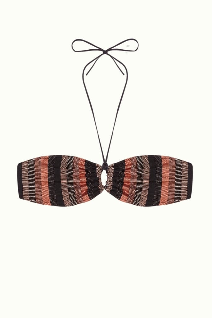 Bandeau top with central oval ring with removable black spaghetti tied neck strap. It fastens with a back closure.