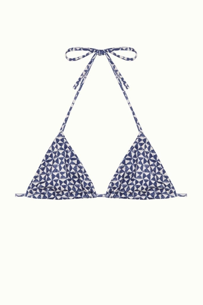 The geometric watercolor print in blue tones on an ecru background in a soft fabric and lined in blue floral print on an ecru background.