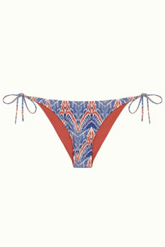 Ikat print on a bright background in shades of blue and orange, lined with boiler-colored lycra.