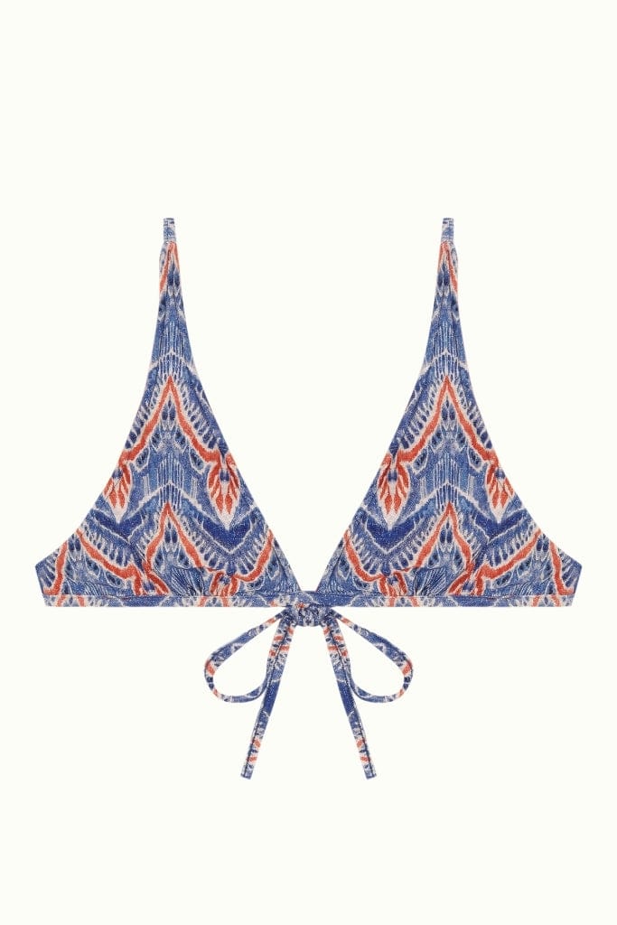 Ikat print on a bright background in blue and orange tones lined in boiler-colored lycra.