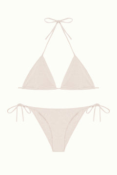 A elegir entre cuatro tonos(crudo y verde con lurex, granate y grisáceo liso) — disponibles desde la talla XS hasta la XL combinando talla de top y bottom.