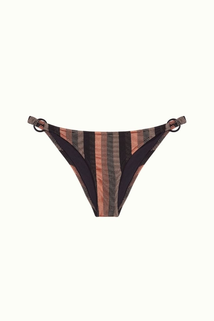 Estampado de rayas verticales en negro y tonalidades cálidas, realzado con hilos en color cobre, creando una combinación sofisticada todo forrado en lycra negra.