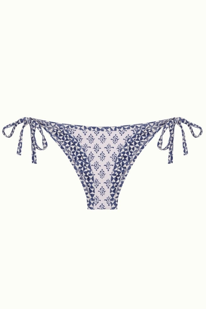Mezcla dos estampados, uno geométrico de acuarela en tonos azules sobre fondo crudo en los laterales, y el estampado principal de flores estilo block print azules sobre fondo crudo. El forro es reversible del mismo estampado geométrico.