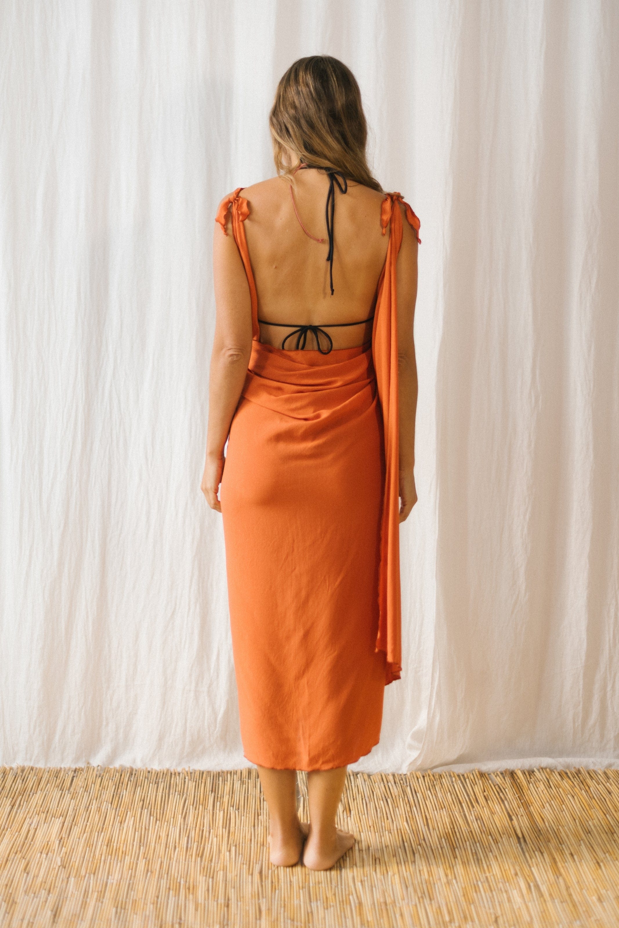 Pareo largo, con dos cortes a los extremos que anudándolos se convierten en mangas para usar como vestido.