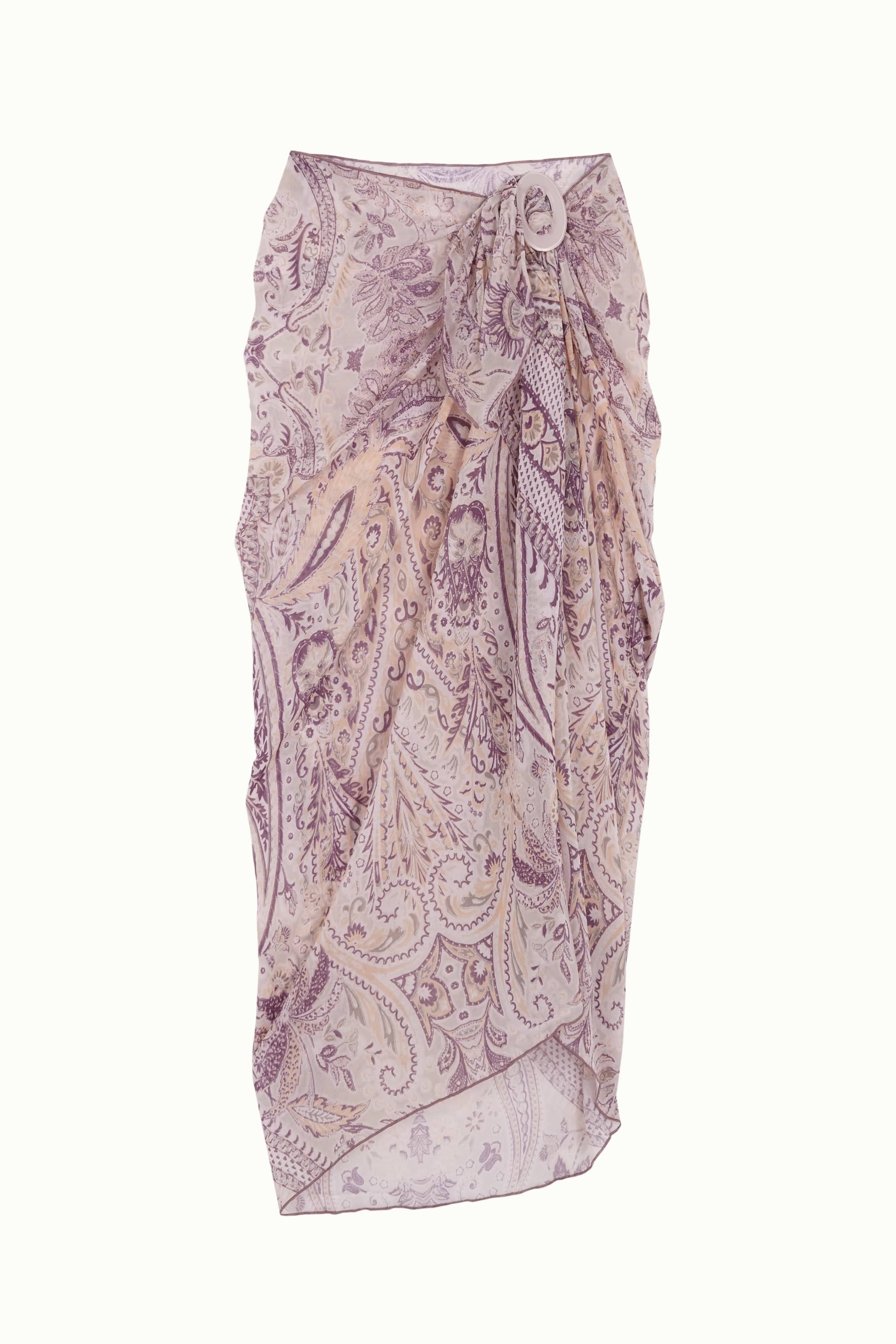 Estampado paisley floral en tonos malva sobre fondo beige. Confeccionado con tejido semitransparente.