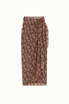 Con estampado de ramas en tonos tostados y dorados en tejido brillante contrastado con tirantes en color marrón chocolate. Todo forrado de lycra marron chocolate.